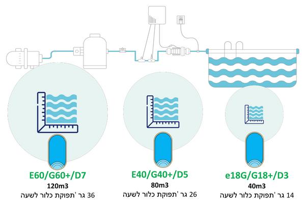 כדי לבחור את הדגם המתאים למקרים שבהם יש צורך בצריכת כלור מוגברת, כגון אקלים או עומס מתרחצים גבוה, עדיף להתייחס לנתוני נפח *בריכה גדולה יותר מזו הקיימת*